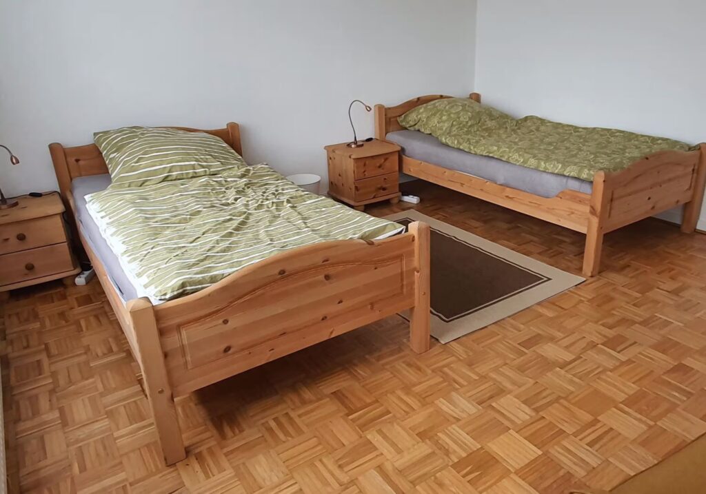 Es gibt zwei Doppelzimmer und ein Einzelzimmer. Küche, Dusche/WC und Esszimmer.